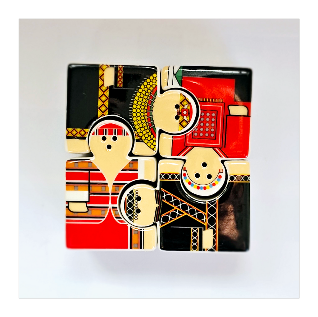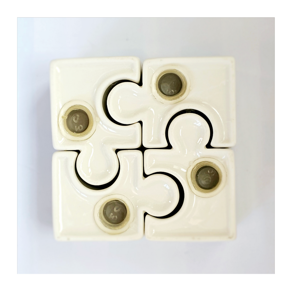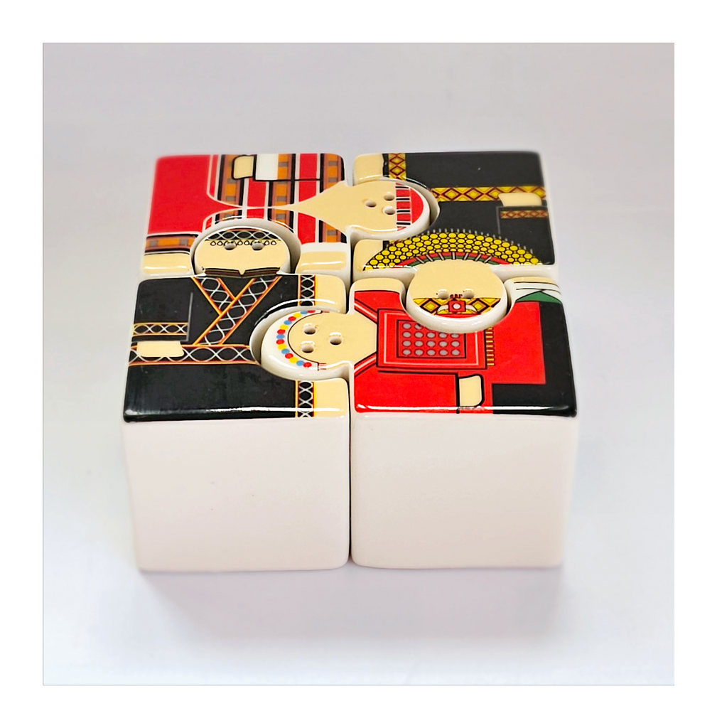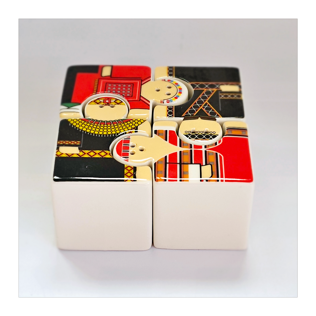 A unique contemporary design cube shaped porcelain salt and pepper shaker, made of two pairs fitted into each other like a jigsaw as seen in the images. It weighs 264 g. Its measurements are 8.5 cm by 8.5 cm, and 4 cm height. In perfect condition, no cracks, no chipping. A great addition to your salt and pepper shaker collection. Collectable. Collector's item.