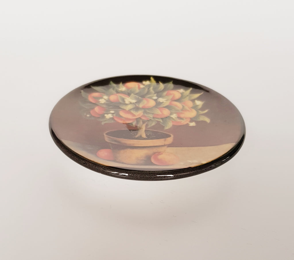 A Ceraplat hand made peach miniature ceramic wall plate /pin dish from Spain. A great addition to your wall plate / pin dish collection. It is pierced in the back for hanging on the wall. It weighs 74 g. Its measurements are Height 1.2 cm, Diameter 9.2 cm. In perfect condition, no cracks, no chipping. Collectable. Collectors' item.