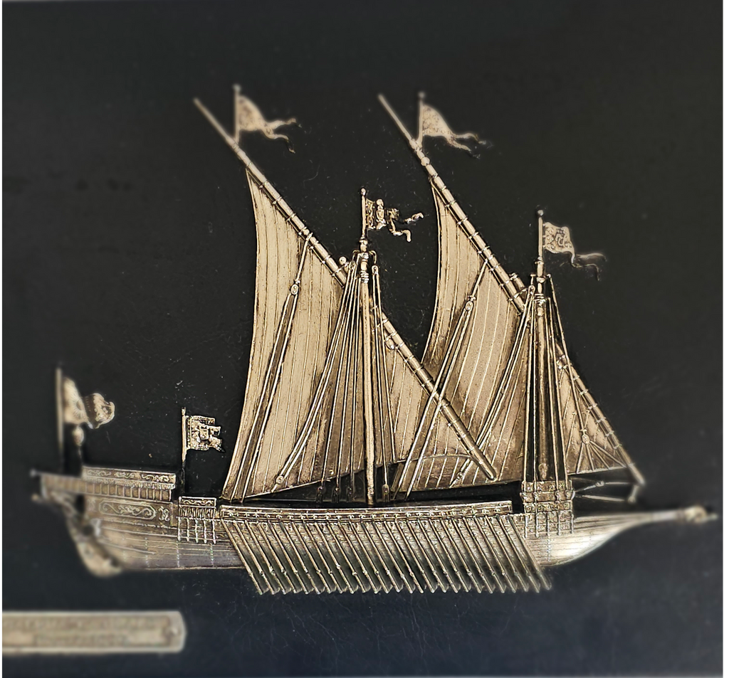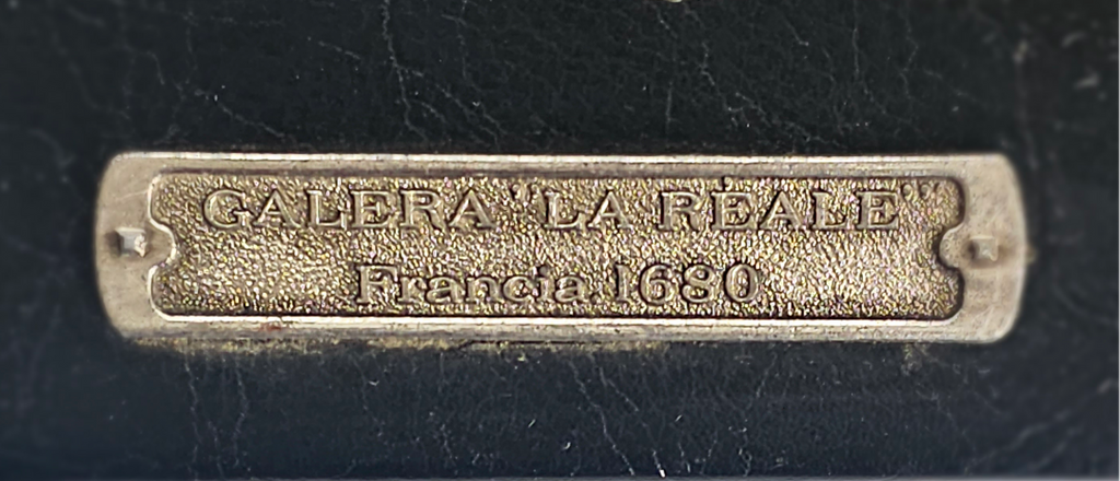 Vintage Leather and White Metal Spanish Wall Plaque "Galera La Reale, Francia 1680"