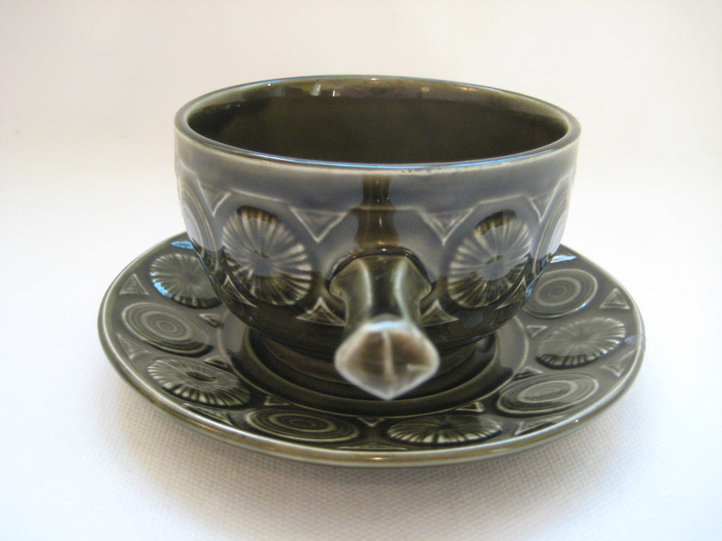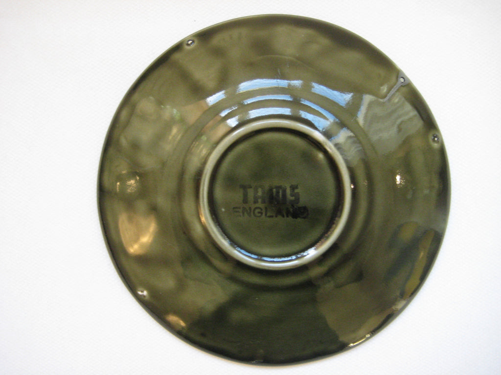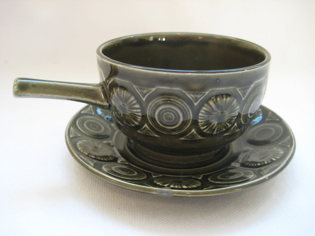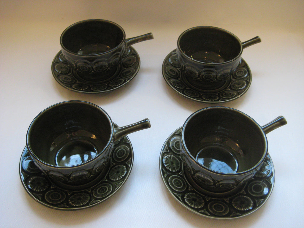 A quirky set of 4 vintage retro 1960's/1970's Tams Ware soup bowls and saucers with embossed pattern in olive green. In perfect condition with no chips, cracks or crazing. The set weighs 1.46 kg. The diameter of each bowl is 10 cm and its height is 6 cm. The diameter of each saucer is 14 cm. Free shipping to UK & Northern Ireland, only £5 to Europe and £10 to the rest of the world.