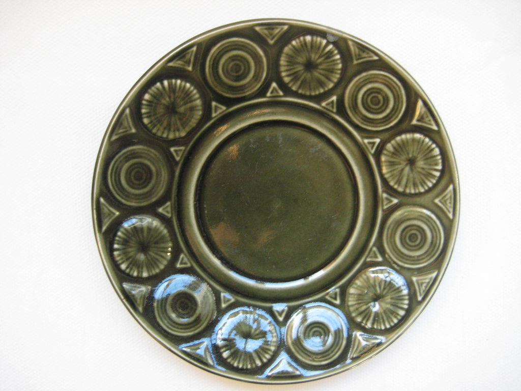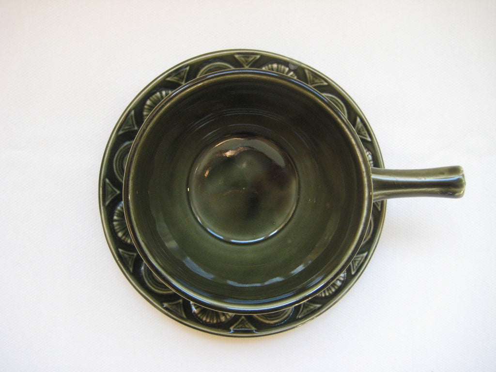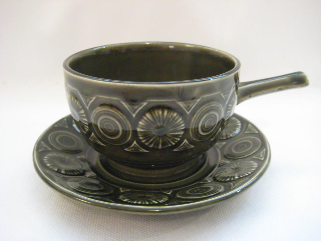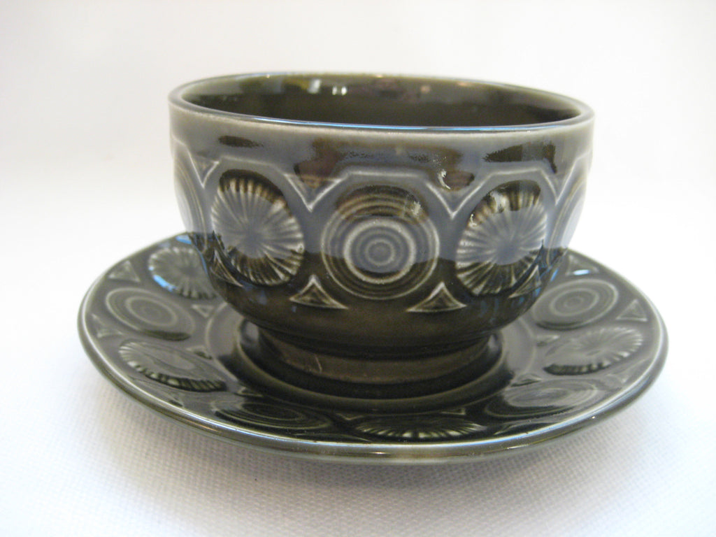 A quirky set of 4 vintage retro 1960's/1970's Tams Ware soup bowls and saucers with embossed pattern in olive green. In perfect condition with no chips, cracks or crazing. The set weighs 1.46 kg. The diameter of each bowl is 10 cm and its height is 6 cm. The diameter of each saucer is 14 cm. Free shipping to UK & Northern Ireland, only £5 to Europe and £10 to the rest of the world.