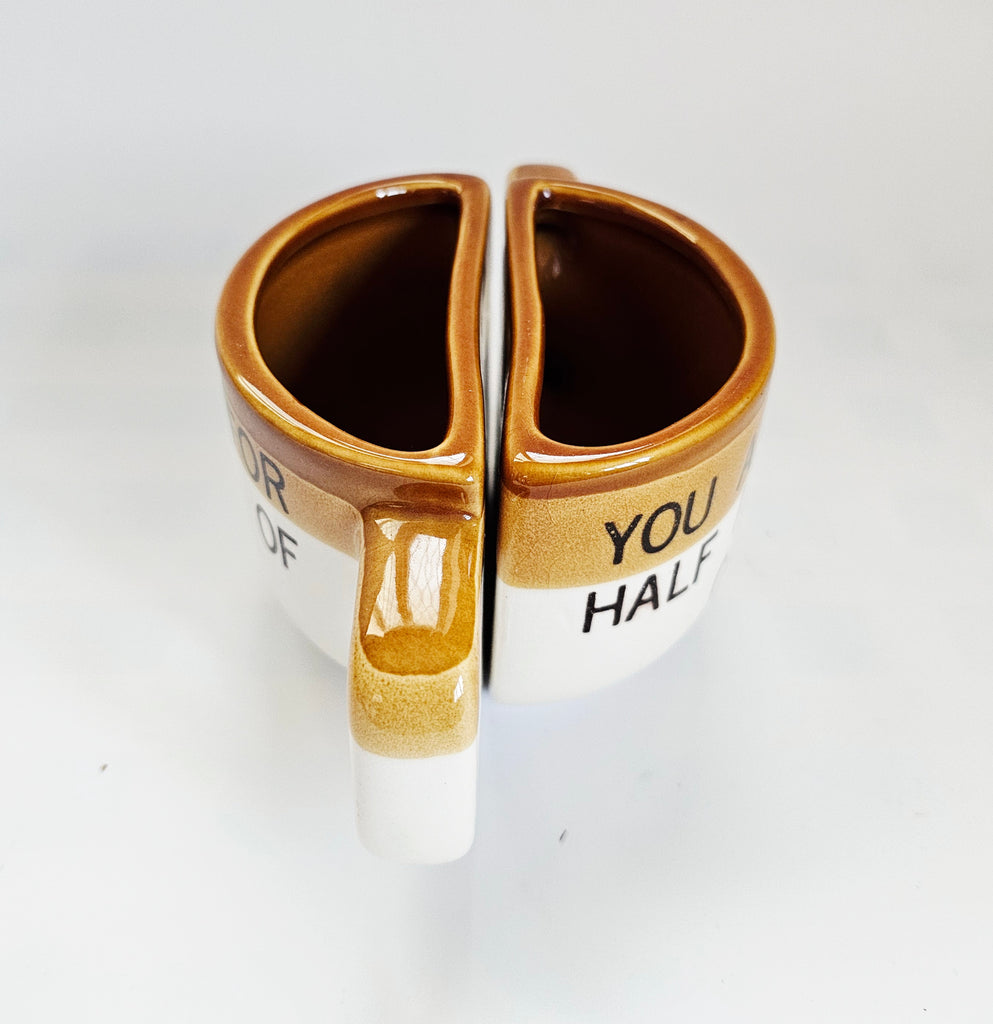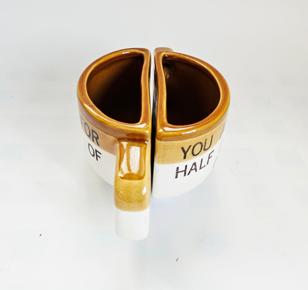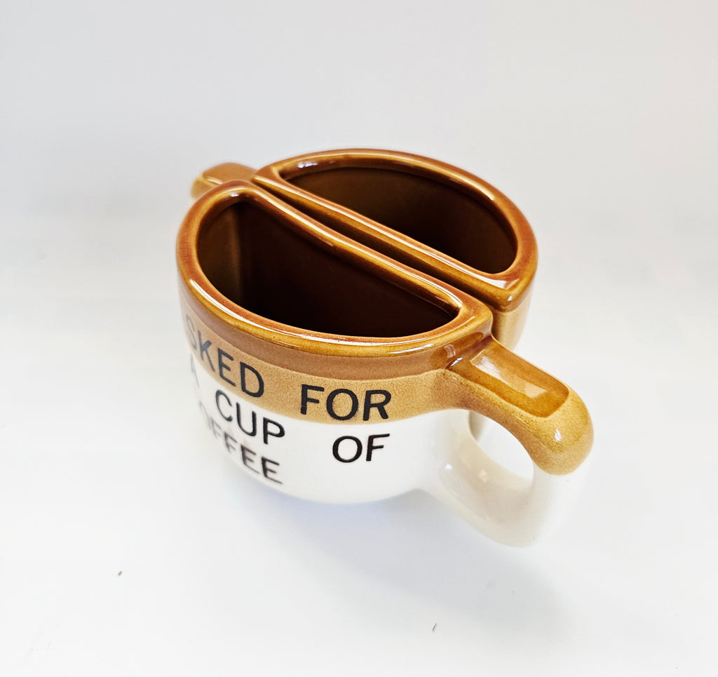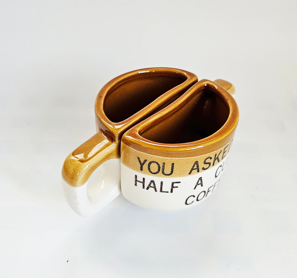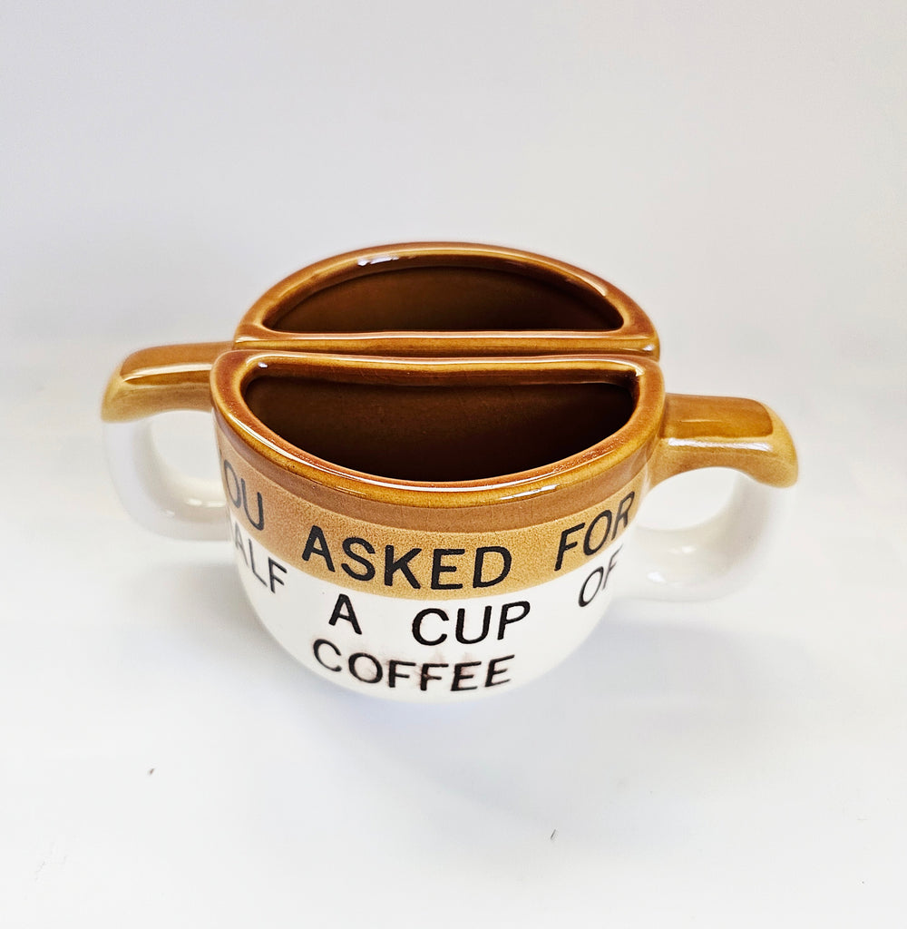 Vintage 1980's Novelty Two Half Coffee Cups / Mugs From Jamaica with the Caption "YOU ASKED FOR HALF A CUP OF COFFEE". It weighs 546g. Its measurements are 10cm diameter and 8cm height. In excellent condition, no chips and no cracks. Makes a quirky gift, or a great addition to your novelty mug collection. collectable. Collector's item.