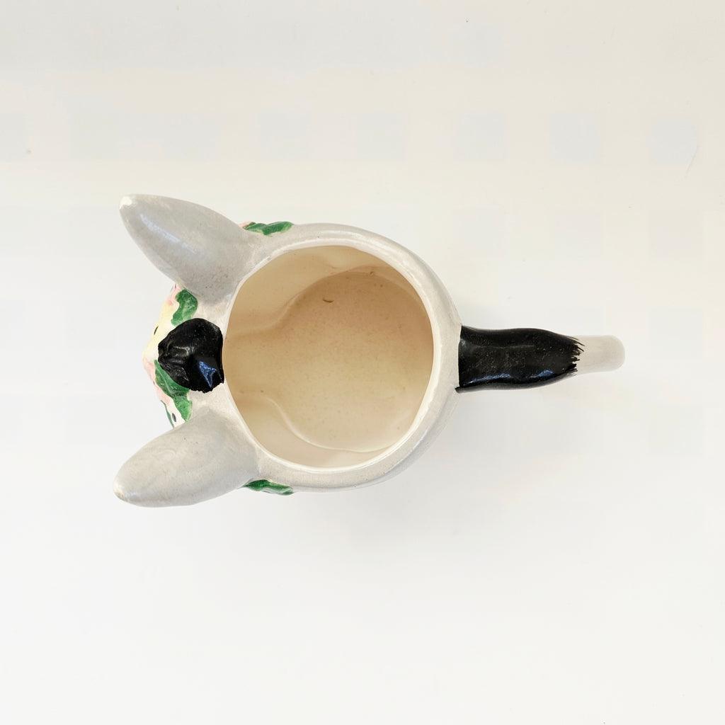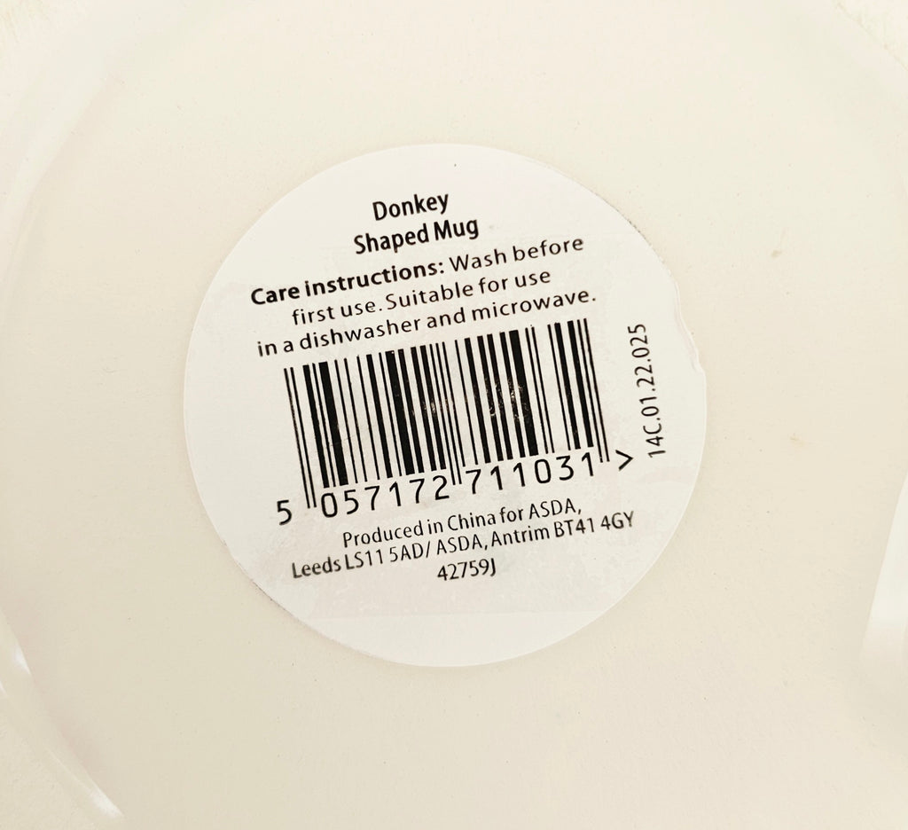 A novelty ceramic donkey shaped tea / coffee mug. It weighs 312g. Its measurements are 15cm wide at its widest, 7.5cm depth, and 13cm height. In excellent condition, no chips, no cracks, and no restoration. Makes a quirky gift, or a great addition to your novelty coffee cup / mug collection. collectible. Collector's item.