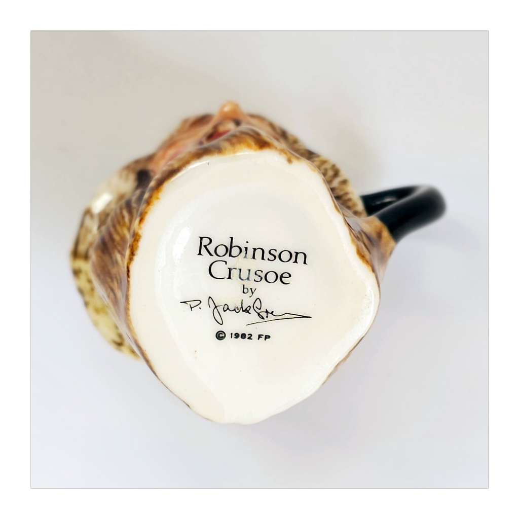 A vintage 1980's glazed ceramic Robinson Crusoe miniature Toby Jug / Character Jug signed Peter Jackson by Franklin Mint. It weighs 26 g. Its measurements are 5 cm width at its widest and 4 cm height. In excellent condition, no chips, no cracks and no restoration. A great addition to your Toby Jug / Character Jug collection. Collectable. Collector's item.