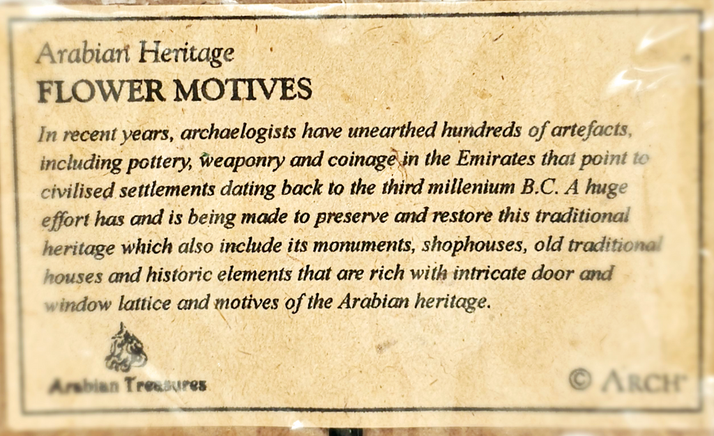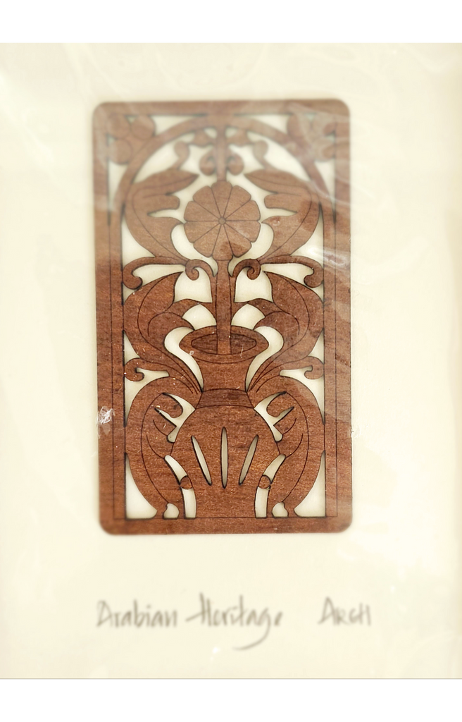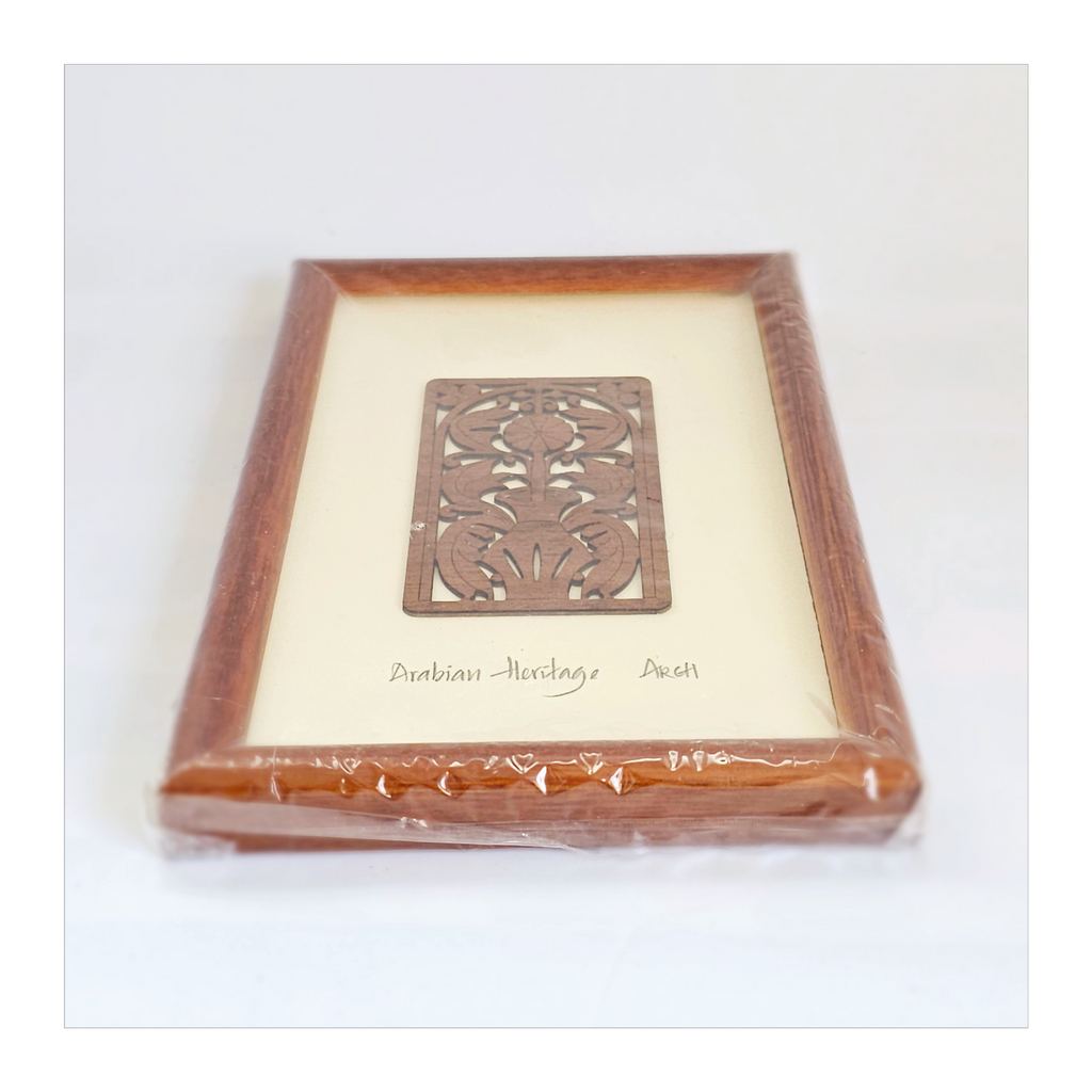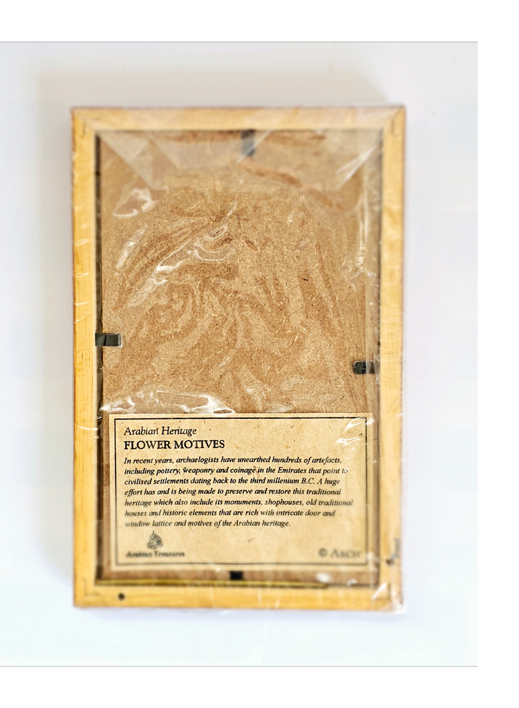 Arabian Heritage Arabian Treasures Framed 3D Wooden Flower Motives wall art, Dubai. It weighs 176 g. Its measurements are 11.5 cm width, 17.5 cm height, and 1.5 cm depth. In excellent condition in its original packaging. A great addition to your Wall Art collection. Collectable. Collector's item.