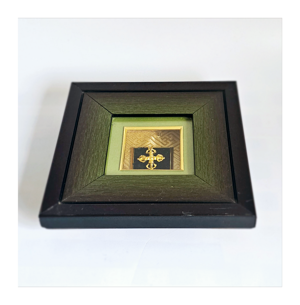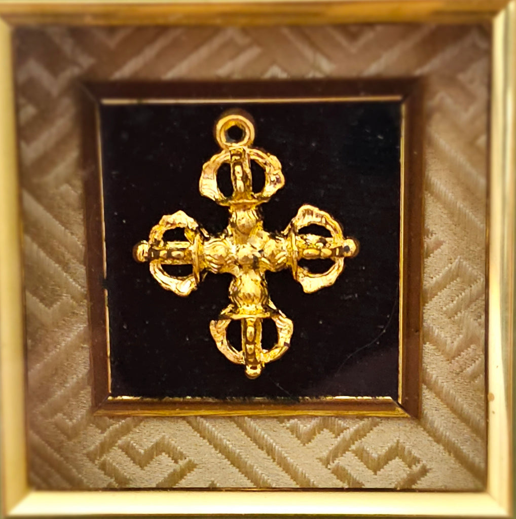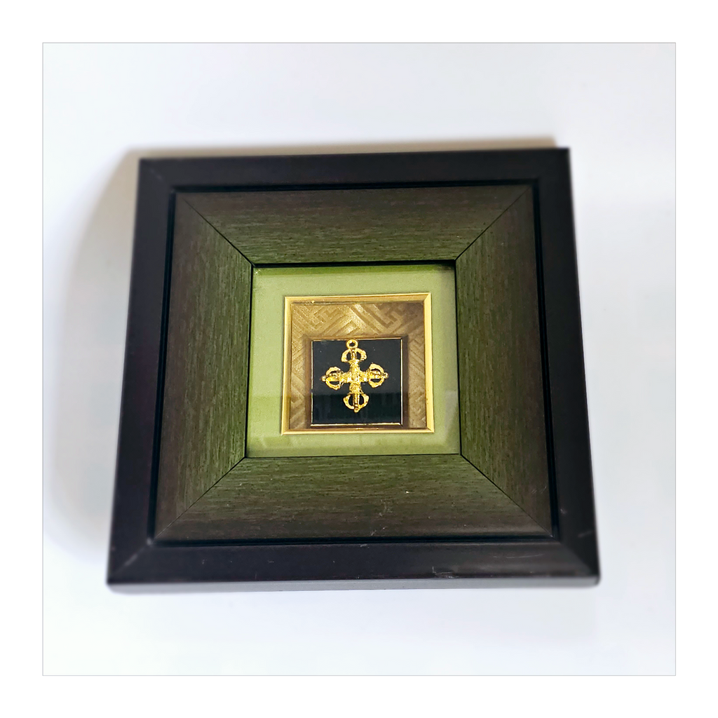 Buddhist Double Dorje Varja Spiritual Power Gold Plated Pendant in a Beautiful Wooden Frame