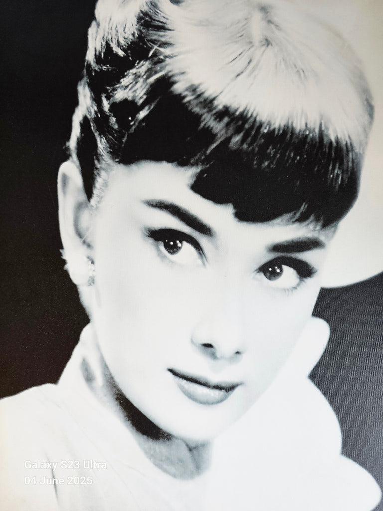A rare vintage 1990's wall art - Giclee Print of Audrey Hepburn's photo on canvas. It weighs 455g. Its measurements are 40cm width, 50cm height, and 2cm depth. In excellent condition, no scuffs, no tears. A great addition to your Audrey Hepburn Memorabilia / Wall Art collection.. Collectible. Collector's item.