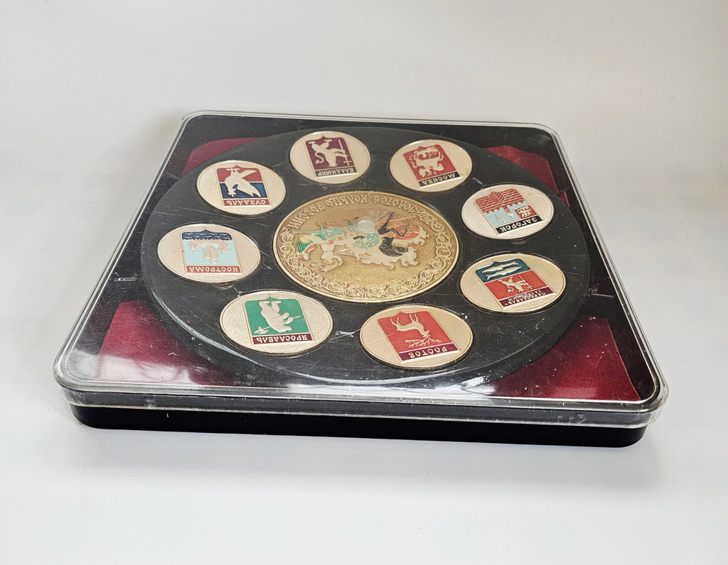 A Framed Vintage Soviet-era Commemorative Medals Souvenir, featuring the coat of arms for the cities of the Golden Ring of ancient Russian cities, including Moscow, Vladimir, and Suzdal. It weighs 1074g. Its measurements are 28cm width, 3cm depth, and 28cm height. In excellent condition. A great addition to your Wall Art / Russian souvenir collection. Collectable. Collectors' item.