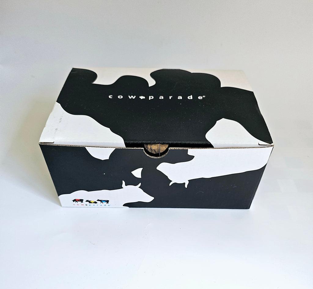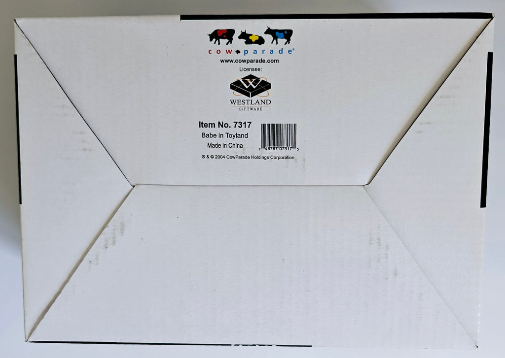 Rare vintage "Babe in Toyland" #7317 cow figurine from London Cow Parade, 2002, designed by the artist, Candida Bayer. In its original box and in excellent condition. It weighs 270g, The box measures 20cm width, 9cm height, and 14.5cm depth. The cow figurine measures 15cm width, 9cm height, and 5cm depth. Makes a great addition to your Cow Parade Cow figurine collection. This is a rare piece and highly collectible. Collectable, Collector's item. Cow Parade's line of cow figurines are amongst the top collectibles in the world. Each figurine is an exact replica of an authentic cow created as part of a Cow Parade event. There are over 500 figurines in the collection. Approximately 8 to 12 cows from each event are reproduced and become part of the collection.