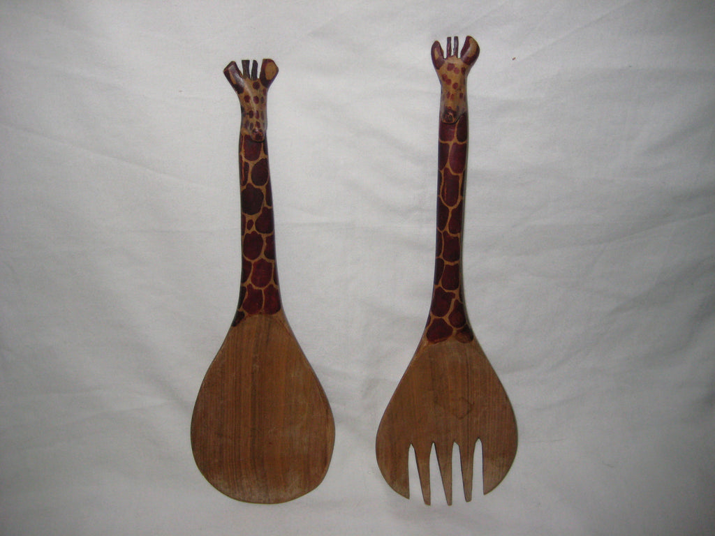 A charming pair of wooden spoon and fork hand carved with handles carved as giraffes. It weighs 0.2 kg and its size is 30 by 10 by 2 cm. Collectable. Collectors' item.