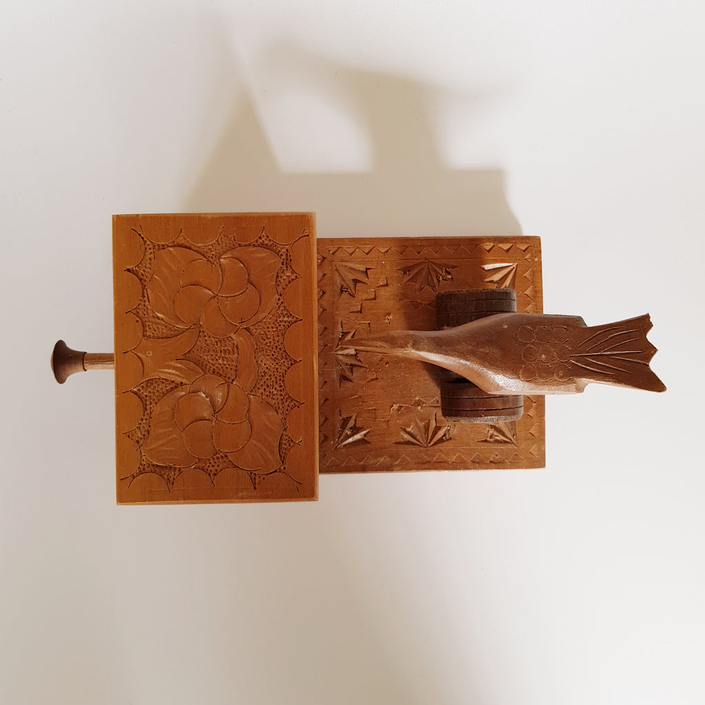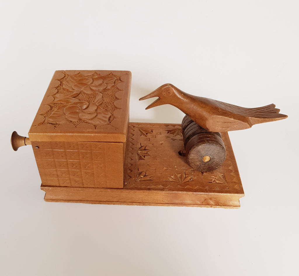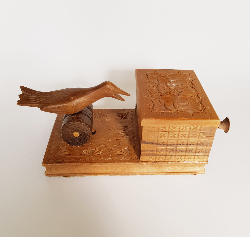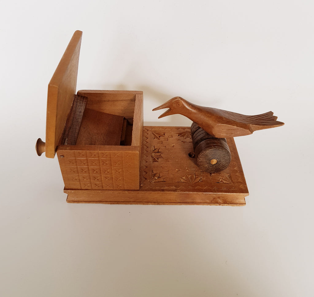 Rare Vintage Wooden Novelty Cigarette Box / Dispenser with a bird mechanism that Collects a Cigarette from the Box - Germany, Hand Made 1960's