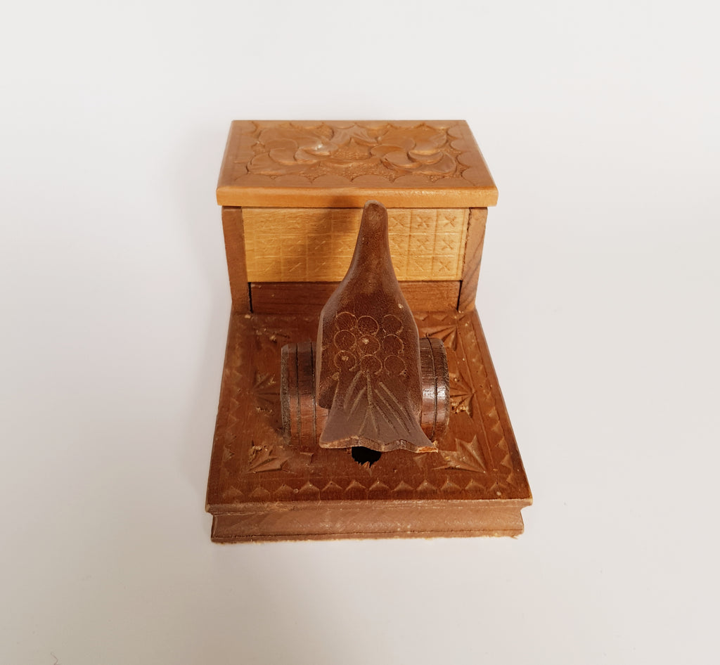 An antique/vintage wooden novelty mechanical cigarette box with pecking bird. The wooden bird dips down to pick up the cigarette when the knob in the back of the box is pushed in. The box is beautifully decorated in wood carvings. A great addition to your collection of novelty items or cigarette boxes / dispensers. It weighs 0.4 kg. Its measurements are Height 9.5 cm, Width 24 cm, Depth 10.5 cm. Overall, it is in a good condition with the exception of a couple of small chips, one on the bird's tail, the other on the side of the box. Collectable. Collectors' item.