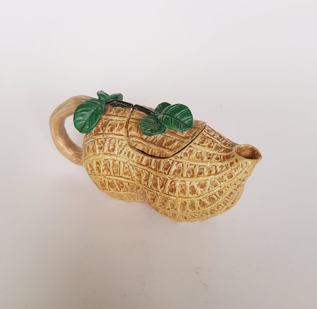 A rare novelty peanut shaped earthenware decorative teapot. A great addition to your teapot collection. It weighs 0.1 kg. Its measurements are Height 5 cm, Width 11 cm, Depth 4 cm. It is in perfect condition, no cracks, no chipping. Collectable. Collectors' item.