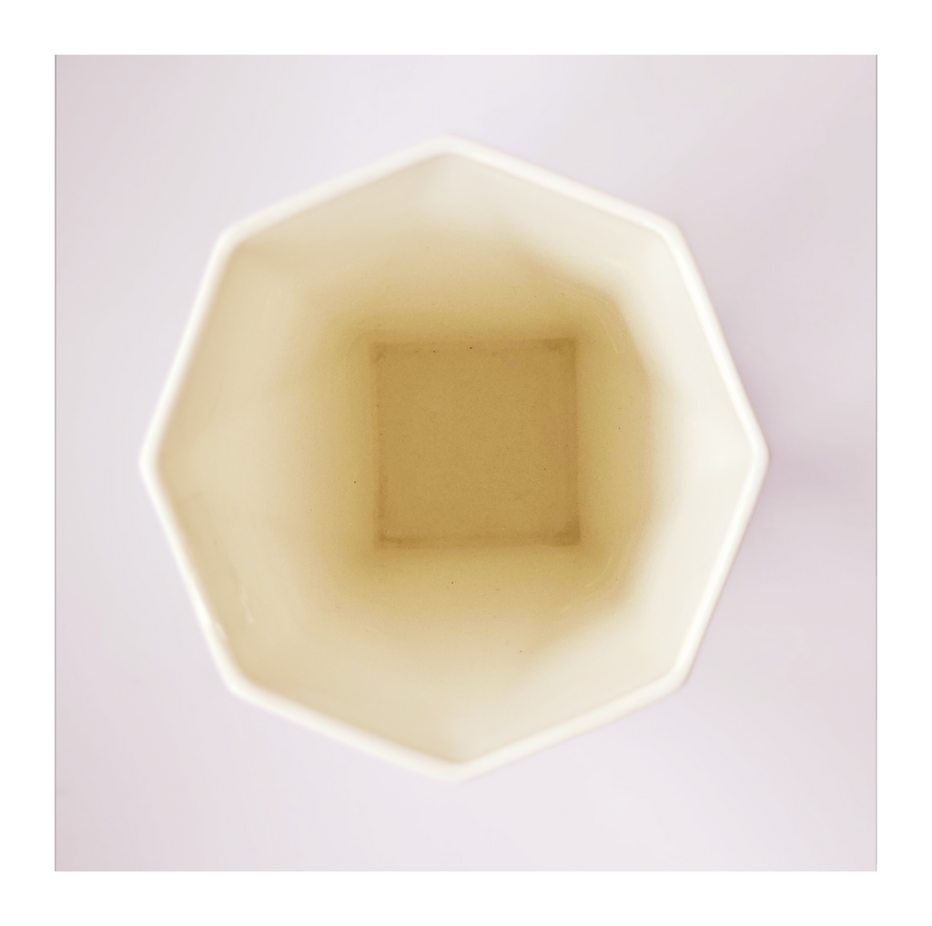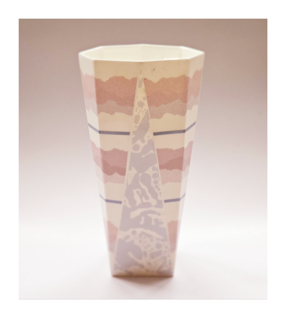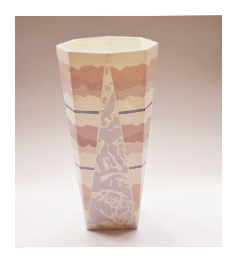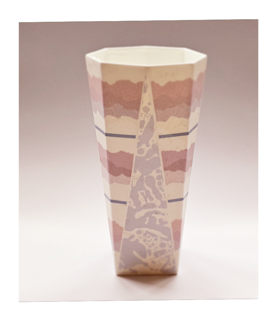 A vintage 1980s geometric vase from Wedgwood featuring fabulous abstract patterns in pastel pink and greys. The vase has an octagonal top tapering cleverly to a square at the base meaning the sides are triangular. It weighs 505 g. Its measurements are 20 cm height, 10cm width at top and 6 cm width at bottom.