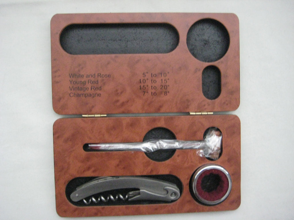 A beautiful wooden box containing wine accessories such as thermometer and corkscrew. It states on the box the temperature range for different types of wine. The box weighs 0.33 kg, and its size is 19 by 10 by 2.5 cm.